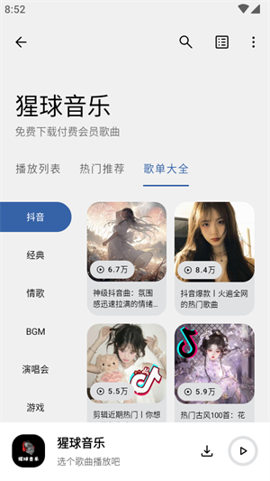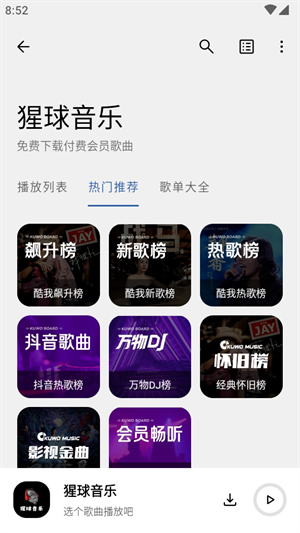 1. 海量歌曲资源:猩球音乐拥有全球最新的音乐资源,用户可以随时随地畅听。