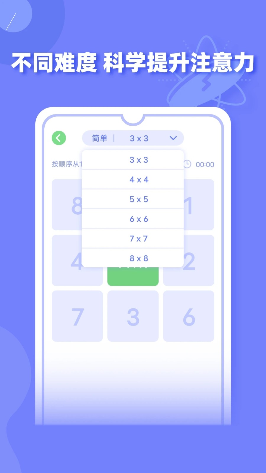 2. 通过解决舒尔特方格的各种问题,帮助用户锻炼注意力、记忆和逻辑思维能力。