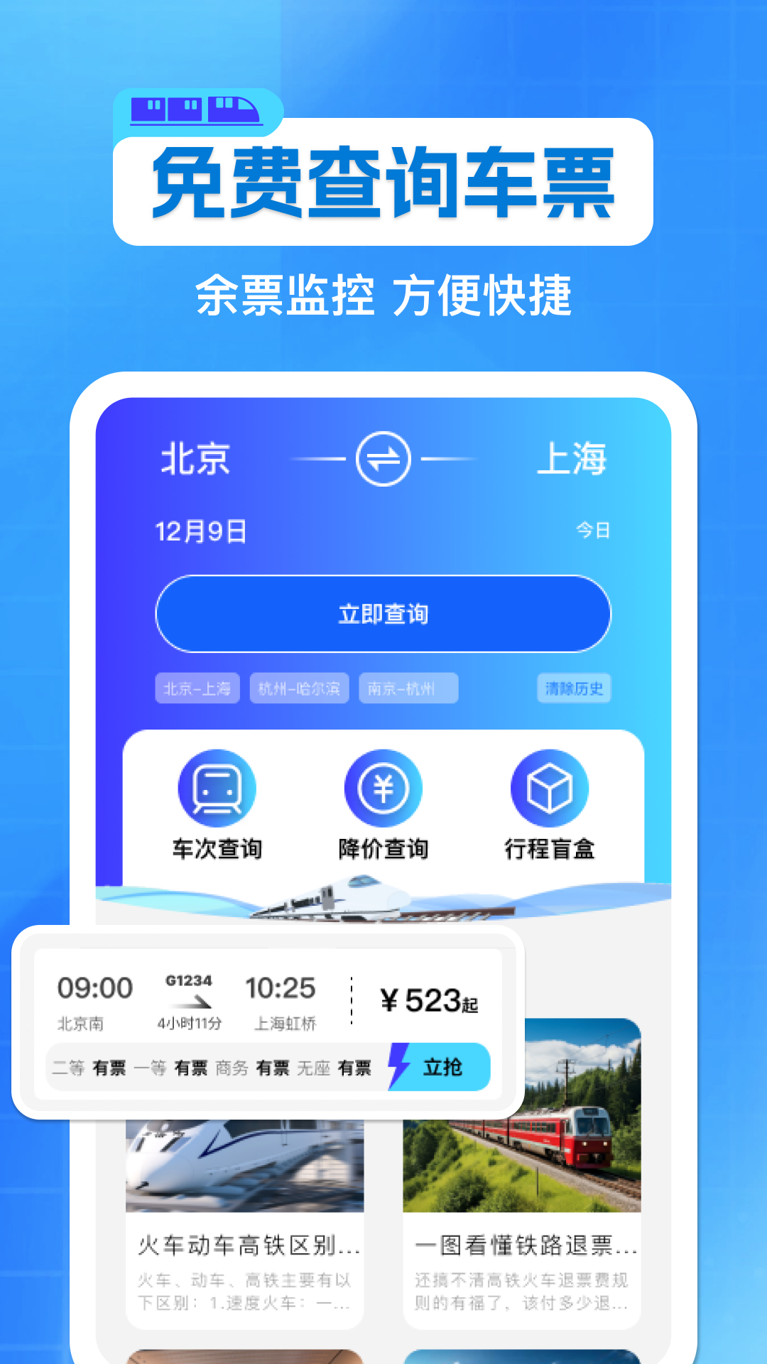 这款app是一款铁路火车票抢票查找软件,可以帮助用户快速查询火车票信息,进行抢票购买。