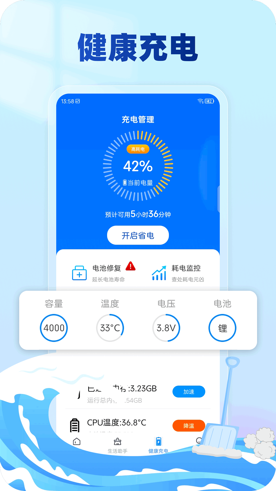 2. 内存加速:可以结束后台运行的无用进程,释放手机内存,提高手机运行速度。
