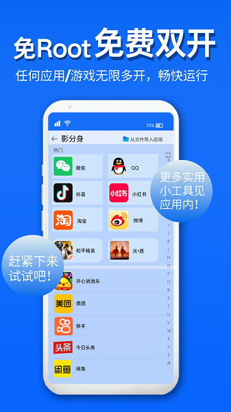 1. 影分身是一款可以帮助用户分身多重身份的APP,让用户可以在不同的场合使用不同的身份。