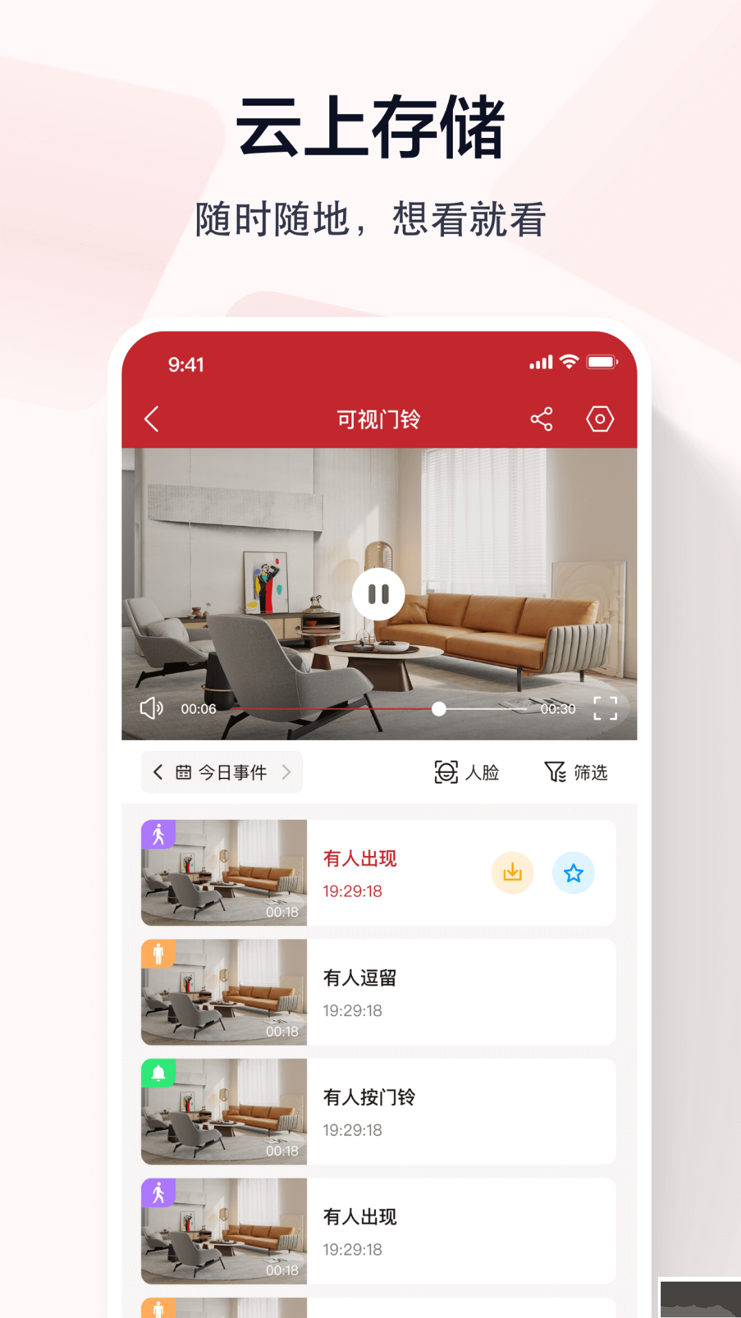 2、提供安全可靠的云存储服务,自动录制告警片段,支持按时间或事件回看历史录像;