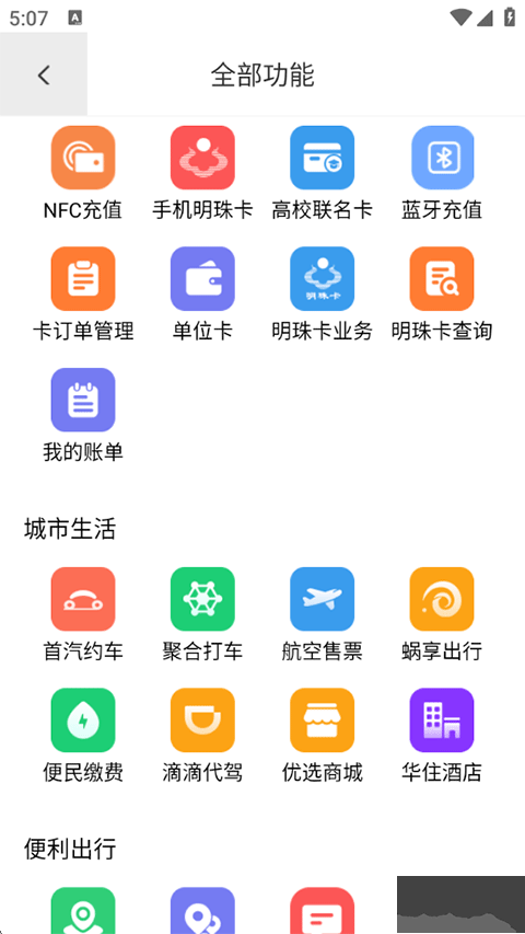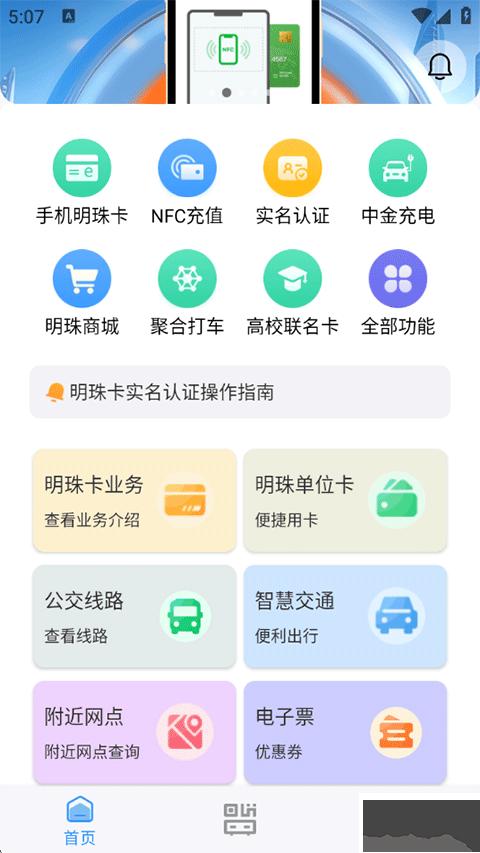 1、启动明珠卡应用,主页面包含NFC功能、充电服务、商城购物、出行叫车、电子明珠卡等多种日常功能。