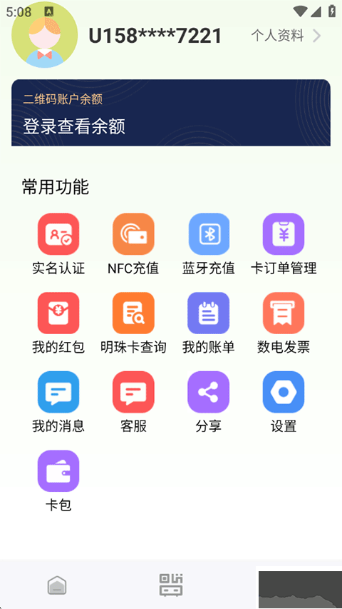4、登录个人账号后,可在“我的”页面查看二维码、余额及其他服务信息。