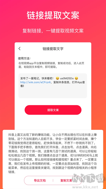 【链接转文字】无需下载视频,只需复制短视频链接粘贴至软件内,即可快速解析并提取视频中的文字内容,一键操作,高效便捷,全面支持主流短视频平台链接转文字!