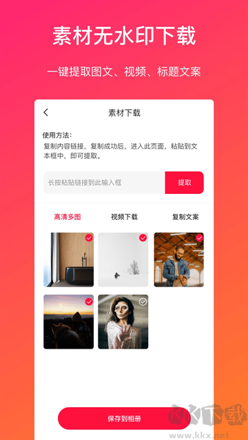 【素材下载/去水印】支持通过链接下载高清图片与视频,自动提取标题与副标题文案,并提供去水印功能,轻松获取干净、清晰的原始素材!