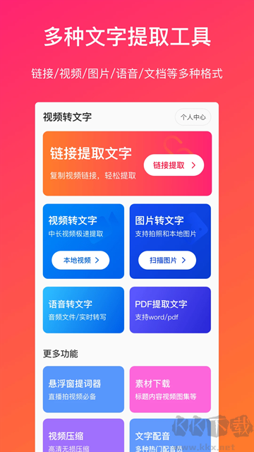 视频转文字app是一款帮助自媒体高效提取文案的实用软件,支持视频链接提取文字、视频转文字、实时语音转文字、音频转文字、图片扫描转文字,以及pdf/word/txt等多格式文本导入功能,提供便捷的提取转换服务,帮助在学习和工作中快速完成各类音视频与文字的转换任务。软件操作简单易上手,能在日常生活中广泛应用,满足不同人群的使用需求,配备悬浮提词功能,让视频拍摄更省心。需要的朋友快来下载试试吧!