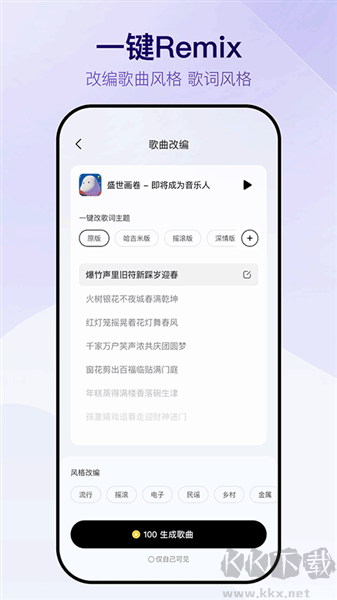 2.【万物皆可Remix】赋予歌曲二次创作生命力,打破原有风格局限。听到喜欢的歌想换种格调?借助独家Remix功能,可将抒情曲转为说唱、男声转为女声,风格随心重塑。更支持上传个人哼唱片段,AI将自动生成全套伴奏,让哼唱变完整作品。