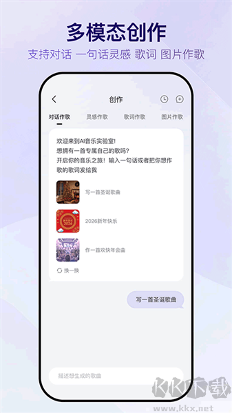 1.【零门槛 AI 创作】无需复杂操作,只需迸发灵感即可即刻成曲。输入一段文字描述、心情感悟或几个关键词,强大的AI引擎便能在几秒内生成专业级词曲及演唱作品。流行、摇滚、爵士、电子、国风等万千音乐风格随心切换,轻松打造专属音乐。