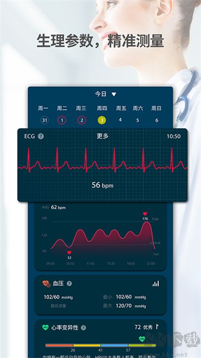 3、记录多项身体指标,例如心跳次数、血液含氧量、心电图、心率变异性及身体压力水平等。