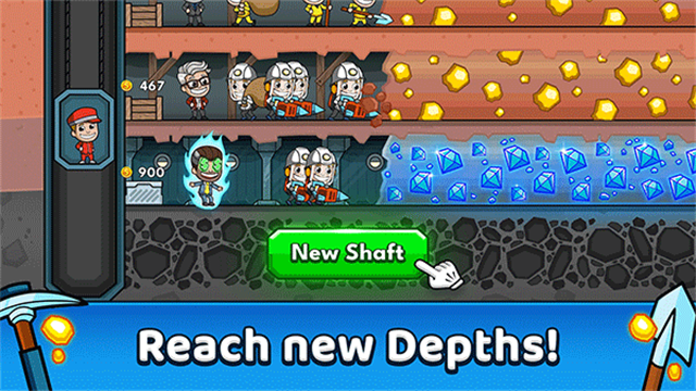 玩家可以雇佣矿工,购买设备和道具来提高采矿效率。